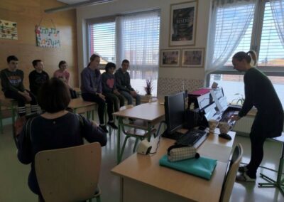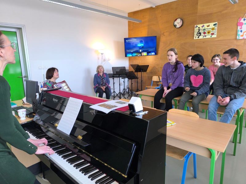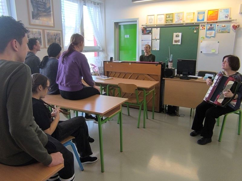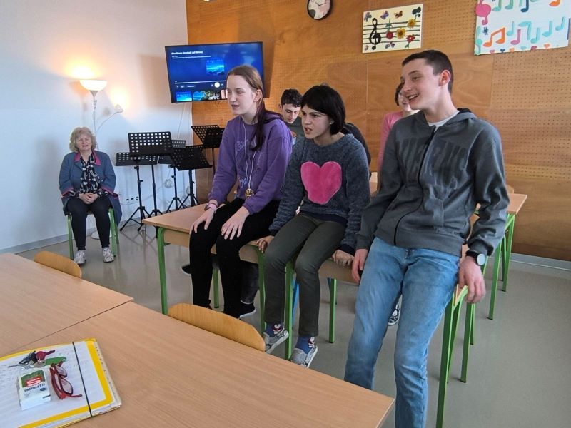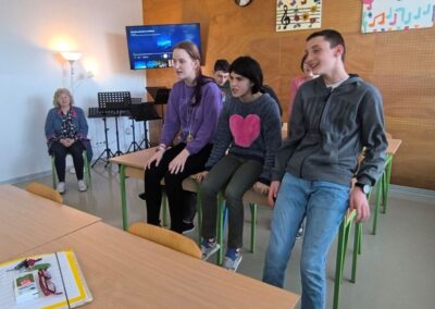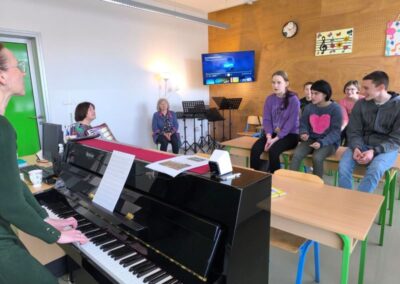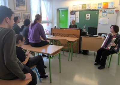 U petak 13.2. bio je stoti dan škole. S tim razlogom okupili smo se šesti i sedmi razredi, zajedno s njihovim učiteljima, u Glazbenoj radionici i prigodnom pjesmom obilježili taj dan. Harmonika i pianino odlično se slažu sa veselim dječjim glasovima koji pjevaju o stotinama zadataka koji se tada riješe. Tih stotine đaka i sto učiteljica kao i stotine osmijeha koji im zare lica.